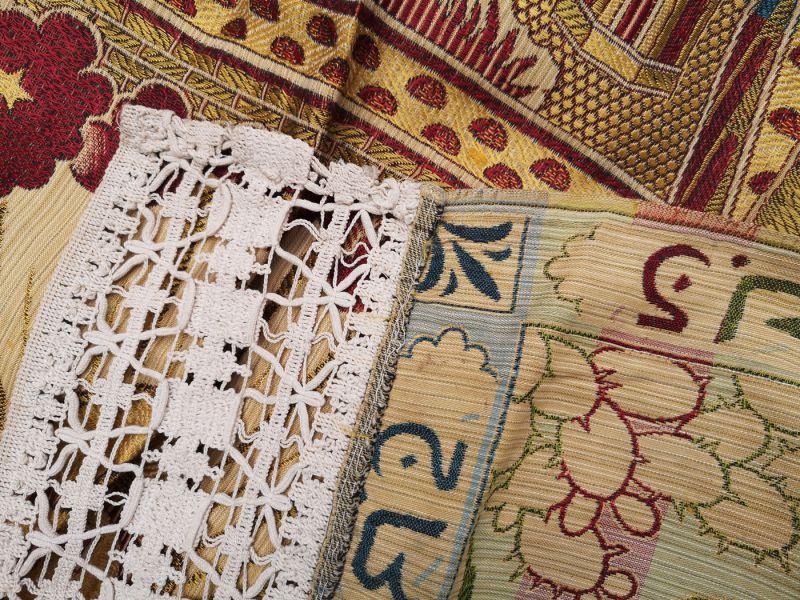 Islamischer Wandbehang mit historischem Motiv; erste Hälfte 20. Jahrhundert; gewebt und mit Häkelbordüren versehen die vermutlich später hinzugefügt wurden; aufwendig gearbeitet und mit bildlicher Darstellung einer Moschee mit Mausoleum, zwei Priesterfiguren und weiteren symbolischen Motiven; umlaufend arabische Inschrift „sîdî abdal'az[îz] bin al-hajj (سيدي عبد العزيز الحاج)“; Inschrift beim Pferd: jâd [vermutlich: jawwâd); die Darstellung des Mannes erinnert an Derwisch / Scheich-Darstellungen aus dem persischen Kulturkreis; vermutlich englisch/indischer Einfluss, sehr selten und gute Erhaltung; Maße: ca. 180 x 142 cm