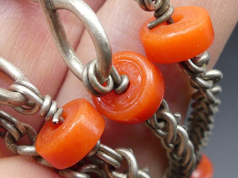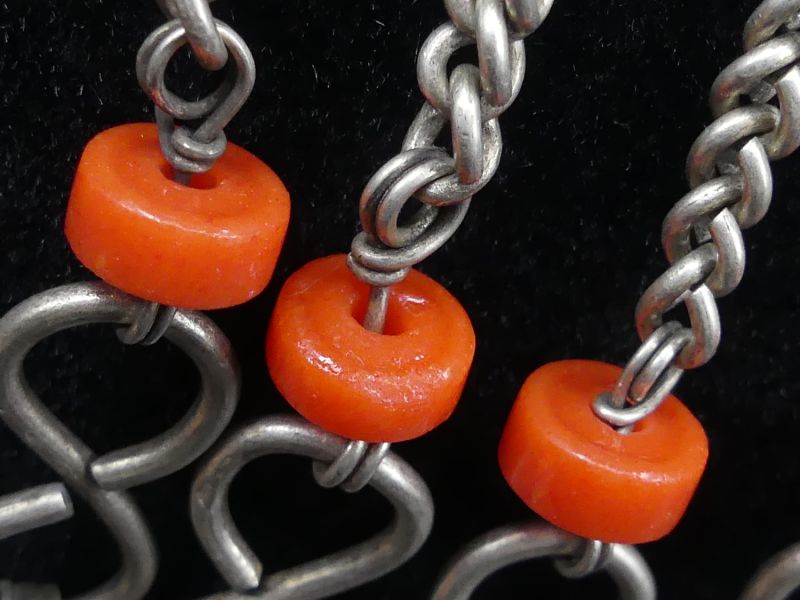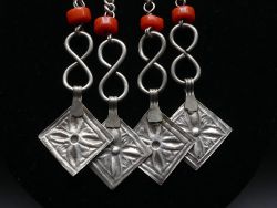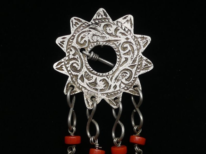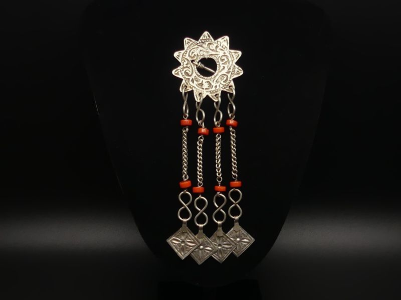 Von der Hauptscheibe hängen vier Kettenanhänger herab. Jede Kette ist mit jeweils zwei tiefroten Korallenperlen akzentuiert, einem Material das in der Berberkultur nicht nur wegen seiner Schönheit, sondern auch wegen seiner schützenden symbolischen Bedeutung hochgeschätzt wird. Die Ketten enden in viereckigen Silberanhängern die ebenfalls gravierte Muster aufweisen.