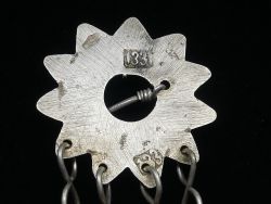 Auf der Rückseite des Silberstücks sind drei traditionelle Punzen eingeschlagen. Eine Punze trägt die Zahl 133 und eine weitere lässt sich als 1331 lesen. Bei diesem nordafrikanischen Silberschmuck handelt es sich vermutlich um eine verkürzte und eine vollständige Angabe des Jahres im islamischen Kalender AH Anno Hegirae. Das Jahr 1331 AH entspricht exakt 1912/1913 n. Chr. und würde somit die Datierung des Stücks in die Epoche des frühen 20. Jahrhunderts eingrenzen. Die dritte Punze ist kleiner und schwerer zu identifizieren könnte aber ein Herstellersiegel oder ein traditionelles arabisches Schriftzeichen sein, das die lokale Herkunft bestätigt. Mit einer stattlichen Gesamtlänge von circa 17 Zentimetern und einem Gewicht von 49 Gramm ist dieses Stück eine seltene Rarität; dem Alter entsprechende Gebrauchsspuren unterstreichen seinen historischen Charakter.
