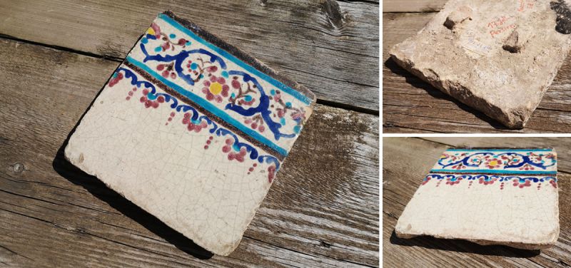 Alte Handbemalte Wandfliese (Rand-Element) aus der Kadscharen-Dynastie (قاجاریان, Qāǧārīyān, Qajar); Persien 18. - 19. Jahrhundert; stilisierter Floraldekor auf cremefarbenen Hintergrund; polychrome bemalt; auf der Rückseite zwei Zapfen und handschriftlicher Vermerk; tolles Sammlerstück; Maße: ca. 19,8 x 19,8 cm; dem Alter entsprechende Gebrauchsspuren; Craquelée, Beschädigungen und Fehlstellen (siehe Fotos); Provenienz: Aus der Sammlung der Gallerie „Ethnos“, Inhaber Noorshams (Kunsthandlung in Ettlingen / Deutschland)