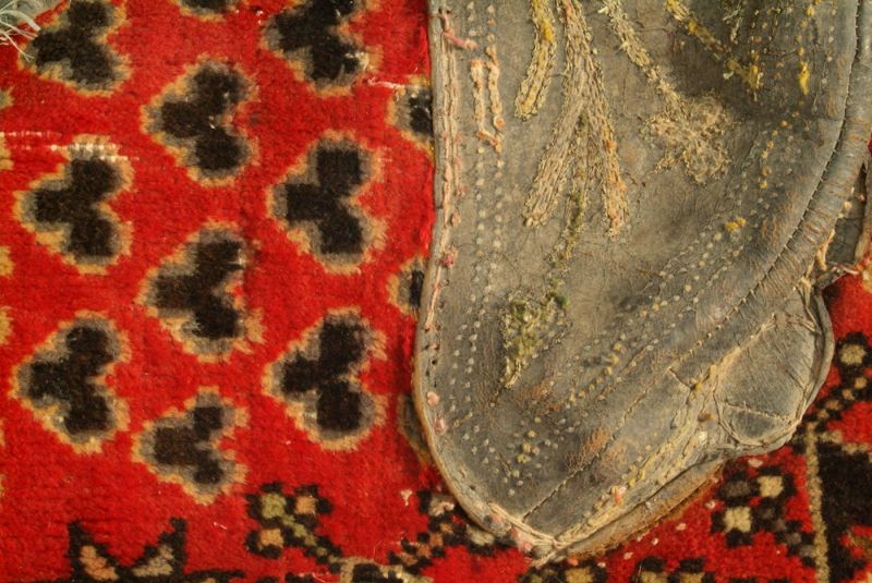 Handgefertigte Satteldecke/Sattel-Überwurf mit Stickerei aus gewebter Wolle und Ledereinsatz ca. 1930/40; von den traditionellen Völkern der Türkei, Kurdistan, Afghanistan, Iran und Zentralasien; der Ledereinsatz ist mit bunter Wolle bestickt; sehr schönes Sammlerstück für Pferdeliebhaber; dem Alter entsprechende Gebrauchsspuren; Maße: 82 cm x 84 cm