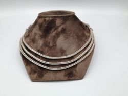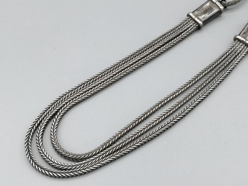 Silberne Beduinen-Halskette aus Turkmenistan, Mitte 20. Jahrhundert; Dreireihige 4-kantige Kette, an den Seiten zusammengefasst und an einer Strickkette befestigt, mit Hakenschließe, Silber punziert; Handarbeit; tolle Patina; dem Alter entsprechende Gebrauchsspuren; Maße: 47,5 cm – Gewicht: 81 g