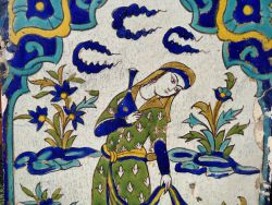 Keramik Wandfliese mit figürlicher Darstellung, Islam; Qajar-Dynastie (Qâjâr; قاجاریان , Qāǧārīyān, Qāǧār, Kadschar)); erste Hälfte 19.Jahrhundert; unter Glasur in Gelb, Grün, Kobaltblau und Türkis auf weißem Grund bemalt; die Fliese zeigt eine junge Frau im Garten und hält eine Flasche in der Hand; Iran 19. Jahrhundert; dem Alter entsprechende Gebrauchsspuren; Maße: ca. 24 x 33,5 cm (2,5 cm dick)