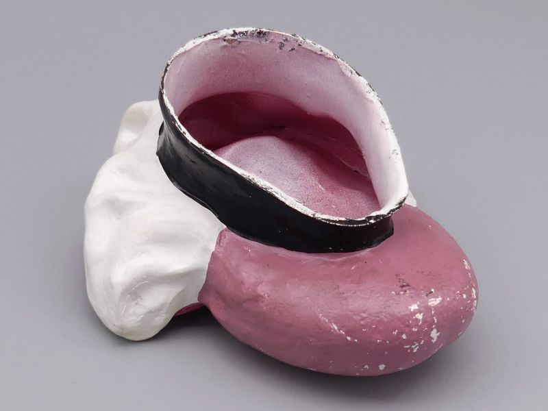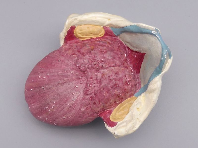 Die Gestaltung und das Material lassen auf eine Produktion in den 1950er Jahren schließen. Obwohl kein Herstellerlogo vorhanden ist weist die Qualität der Bemalung und die anatomische Exaktheit auf ein hochwertiges Institutswerkzeug hin. Mit seinen Maßen von ca. 16 x 18 x 10 cm hat das Objekt eine beeindruckende Präsenz und eignet sich hervorragend als exklusives Dekorationsstück für eine moderne Arztpraxis oder als Highlight in einer anspruchsvollen Wunderkammer-Sammlung. Die authentische Erhaltung und die kräftigen Farben machen dieses medizinische Modell zu einem seltenen Fundstück für Liebhaber historischer Naturwissenschaften, kleine Chips, Dellen, etwas oberflächlicher Abrieb, alte Lagerspuren; insgesamt schöner Originalzustand; dem Alter entsprechende Gebrauchsspuren (siehe Fotos)