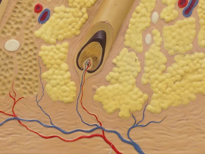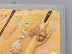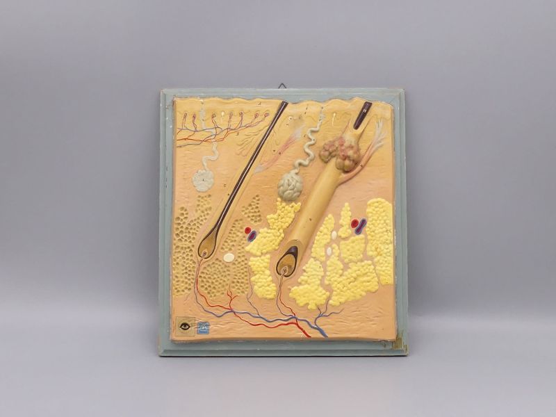 Das antike Modell besticht durch seine wissenschaftliche Exaktheit und die plastische Darstellung anatomischer Details. Deutlich zu erkennen sind zwei große Haarfollikel mit Talgdrüsen (Papillen) im Gewebe. Die feine Handbemalung hebt die verschiedenen Schichten der Epidermis, Dermis und Subkutis hervor, die zusätzlich für Lehrzwecke nummeriert sind.
