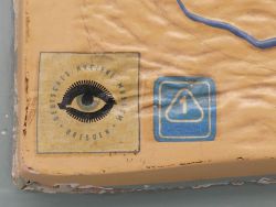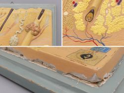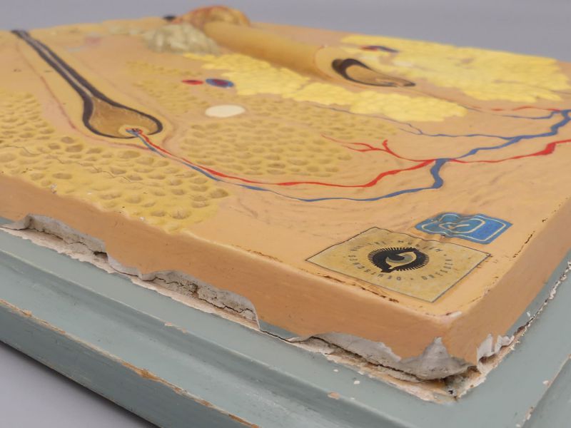 Dieses außergewöhnliche anatomische Relief-Modell der menschlichen Haut ist ein authentisches Sammlerstück aus der Zeit um 1940. Hergestellt wurde das detaillierte Lehrmittel vom renommierten Deutschen Hygiene-Museum in Dresden, welches weltweit für seine hochwertigen anatomischen Modelle bekannt war. Das Modell zeigt einen komplexen Querschnitt der Hautschichten in natürlicher Größe und ist aus Gips gefertigt, farbig von Hand gefasst und stabil auf einer grauen Holzplatte montiert. Auf der Oberfläche befinden sich zwei originale Aufkleber: Einer mit dem markanten Augen-Logo und der Aufschrift "Deutsches Hygiene-Museum Dresden" sowie ein blauer Aufkleber mit der Nummer "1".