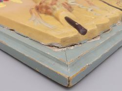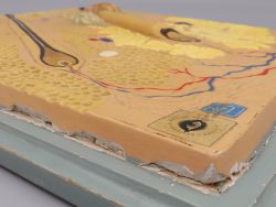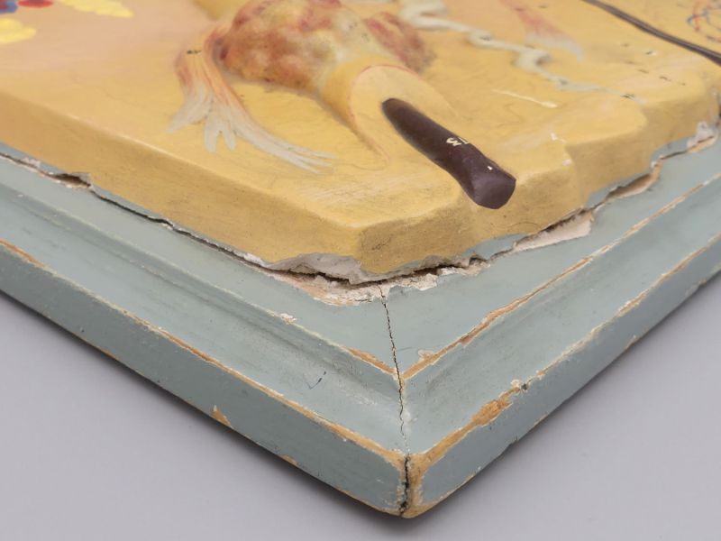Das Objekt befindet sich in einem authentischen antiken Zustand mit einer gewachsenen Patina, die seinen historischen Wert unterstreicht. Wie auf den Detailfotos zu sehen ist, gibt es entlang der Ränder Risse im Gips zur Holzplatte hin. Diese sind altersbedingt und das Gipsmodell ist nach wie vor fest mit der Platte verbunden. Ein seltener Fund aus einem alten österreichischen Schularchiv. Mit seinen Maßen von ca. 35,5 x 38,5 cm (Holzplatte) und ca. 31 x 34 cm (Modell) ist dieses handbemalte Vintage-Relief ein markantes Highlight für jede anspruchsvolle Wunderkammer-Sammlung oder als fachspezifisches Dekorationsobjekt in den Räumlichkeiten einer Arztpraxis. Ein ideales Stück für Liebhaber historischer Naturwissenschaften und musealer Exponate, kleine Chips, Dellen, oberflächlicher Abrieb, alte Lagerspuren; insgesamt schöner Originalzustand; dem Alter entsprechende Gebrauchsspuren (siehe Fotos)