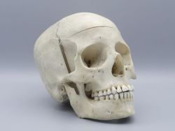 Dieser historische medizinische Lehrschädel stammt aus der Privatsammlung eines Facharztes (20. Jahrhundert). Der Schädel ist mit handschriftlichen Nummern versehen, die der Zuordnung der einzelnen Schädelteile dienen. Es handelt sich um einen menschlichen Schädel mit schöner Patina sowie einer klar definierten, dunklen Koronanaht (Sutura coronalis). Das Schädeldach (Calvaria) wurde präzise geschnitten und lässt sich dank Metallhaken und Federmechanismus gemeinsam mit dem Unterkiefer leicht abnehmen und teilen. Die Schädelhöhle befindet sich in einem sauberen und gut erhaltenen Zustand. Das nahezu vollständige Gebiss weist lediglich den Verlust eines Zahns auf. Der Schädel ist in drei Teile zerlegbar. Typische Gebrauchsspuren, die den Einsatz als Lehrmittel belegen, sind vorhanden. Insgesamt befindet sich der Schädel in gutem Zustand. Maße: ca. 16,5 x 13 x 15,5 cm (LxBxH)