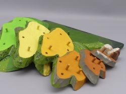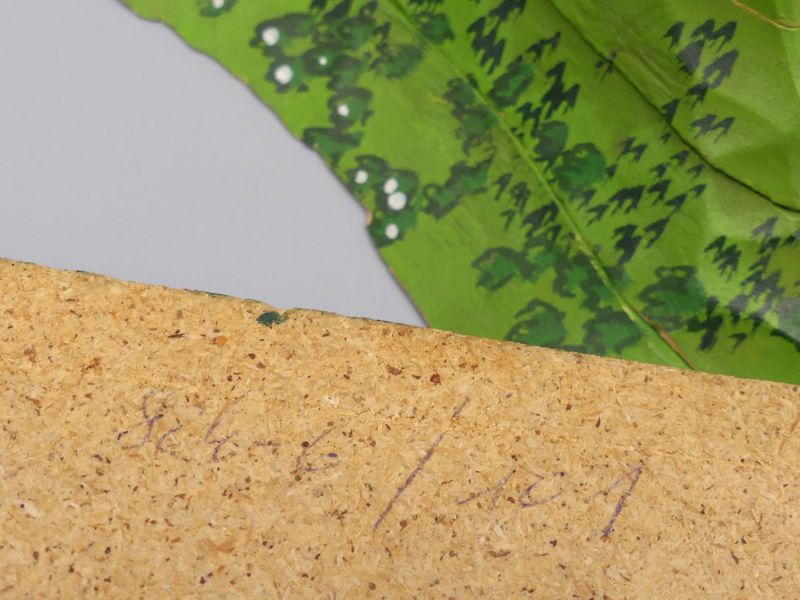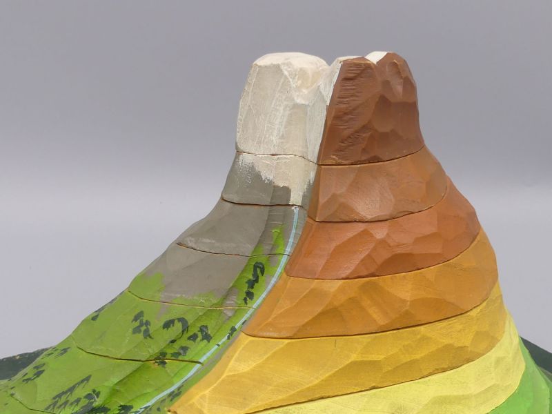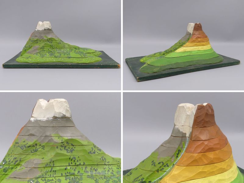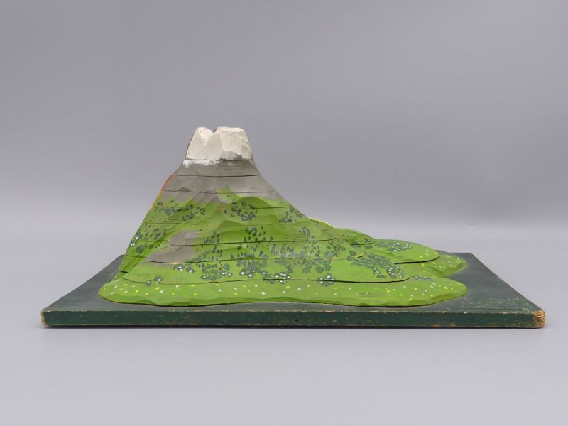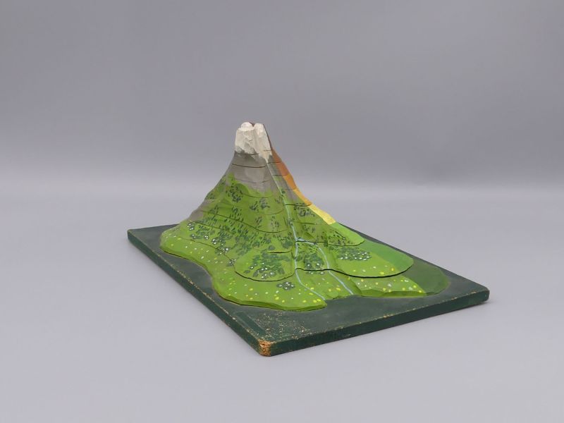 Großartige Handarbeit - Das Modell ist aus Holz gefertigt und liebevoll handbemalt, mit Details wie einer weißen Gipfelkappe und einem Bachlauf. Während eine Seite des Berges naturgetreu mit Wiesen, Fels und Schnee gestaltet wurde, zeigt die gegenüberliegende Seite eine didaktische Bemalung in abgestuften Gelb- und Brauntönen, um das abstrakte Prinzip der kartografischen Höhenschichten begreifbar zu machen. Seine isoliert-kegelförmige Gestalt weckt Assoziationen an berühmte Berge, wie den Kirkjufell in Island oder an die idealisierte Form majestätischer Stratovulkane. Die genaue Identität des abgebildeten Berges bleibt dabei ein neugierig machendes Rätsel. Die am Boden auf Holz geschriebene Kennzeichnung 824-6/101 ist höchstwahrscheinlich eine interne Inventarnummer der ehemaligen Schule.