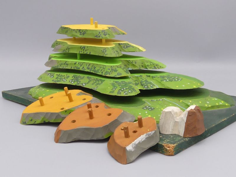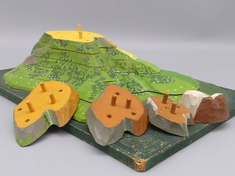 Entdecken Sie ein außergewöhnliches topographisches 3D-Reliefmodell eines Hochgebirges, gefertigt in der Mitte des 20. Jahrhunderts. Dieses historische Lehrmittel aus einer österreichischen Schule ist ein faszinierendes Stück der frühen dreidimensionalen Kartographie. Das Modell besteht aus neun präzise gefertigten Holzsegmenten, die den Berg Schicht für Schicht (topographische Daten) darstellen. Die Besonderheit liegt darin, dass es sich um ein echtes Schnittmodell handelt: Die Segmente lassen sich vollständig auseinandernehmen.