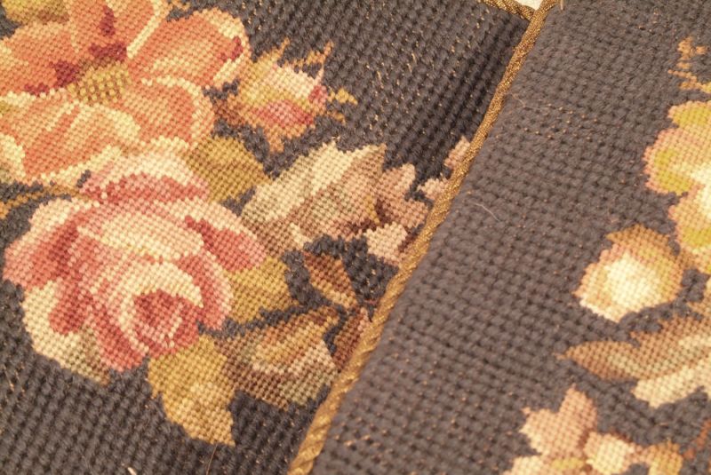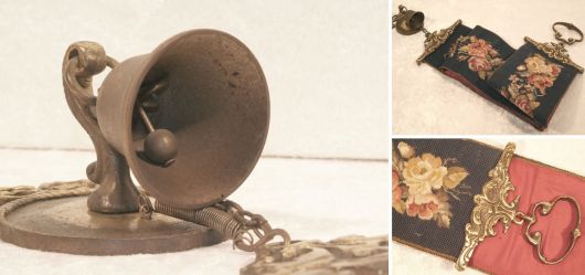 Alte Wandglocke aus Messing mit Gobelin gefertigtem Rosenmuster; Die Glocke ist vollständig