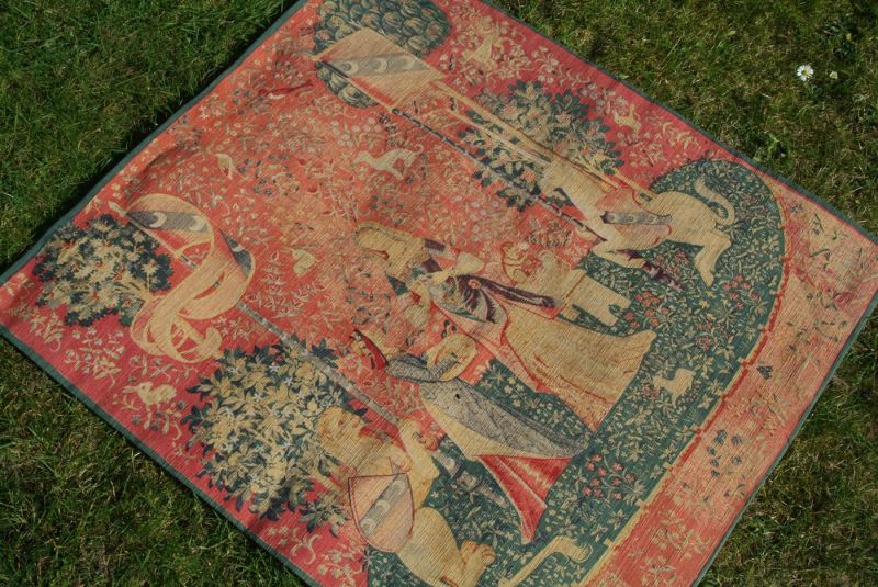 Mittelalterlicher Wandteppich Reproduktion "Die Dame mit dem Einhorn" der Geruchsinn; Beim Original handelt es sich um eine der berühmtesten Wandteppiche des Mittelalters; Limitierte Auflage 05/88 Ref:37 ; Mitte 20. Jahrhundert, Edition: D'Art de Rambovillet, Ateliers de Reproduction d'Oeuvres d'Art, Sujet: Dame à la Licorne (l' odorat), Musee: Cluny, Paris; Maße: 86 cm x 94 cm