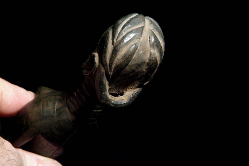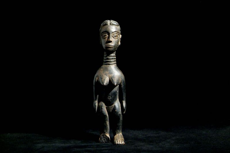 Weibliche Figur der Baule-Yaure / Elfenbeinküste; 1940 – 1960; streng aufrecht stehende weibliche Standfigur, die Arme und Hände eng anliegend an den Körperseiten haltend; langer Hals mit fünf geschnitzten Ringen; eine Wange mit Narbenschmuck; große mandelförmige Augen, kunstvolle Frisur mit freigeschnitztem Haarstrang der am hinteren Ende zu einer Öse wird (diente vermutlich zum befestigen); diese Figur lässt ansatzweise einen Kolonstil erahnen; schwarz patiniert; Trockenrisse; ein Fuß beschädigt und schwarz bemalt (Ölfarbe, Teer?); dem Alter entsprechende Gebrauchsspuren; Maße: 20,5 cm; Provenienz: Nachlass / Sammlung Gundi und Heinz Scharpf (1940-2018). Die berühmten Tierpfleger aus dem zoologisch-botanischen Garten Wilhelma in Stuttgart, hatten die afrikanischen Objekte während ihrer Reisen nach Kamerun und Westafrika in den 1960/70er Jahren erworben;