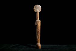Sehr schlanke afrikanische „Biga-Puppe“ mit überlangem Hals; Fruchtbarkeitssymbol der Mossi; erste Hälfte 20. Jahrhundert; die Mossi sind das größte Volk im westafrikanischen Land Burkina Faso; aus Holz geschnitzt und zum Teil mit eingeschnittenem Liniendekor am Kopf, an der Brust und auf den Beinen; schöne Gebrauchspatina und abgegriffen; die „Biga“ Puppen wurden von den jungen Frauen bis zu einer eintretenden Schwangerschaft im Kleid getragen, nach der Geburt werden die Puppen auf den Hausaltar gestellt oder der nächsten Generation übergeben; stirbt das Kind bei der Geburt wird sie verbrannt oder den kleinen Mädchen zum Spielen übergeben; dem Alter entsprechende Gebrauchsspuren; Maße: 26,8 cm; Provenienz: aus dem Nachlass der Sammlung „Jürgen Maurer (1939-2018)“, bekannter Geschäftsmann, Kunstsammler und Chronist aus Heppenheim http://www.kunstsammlungmaurer.de