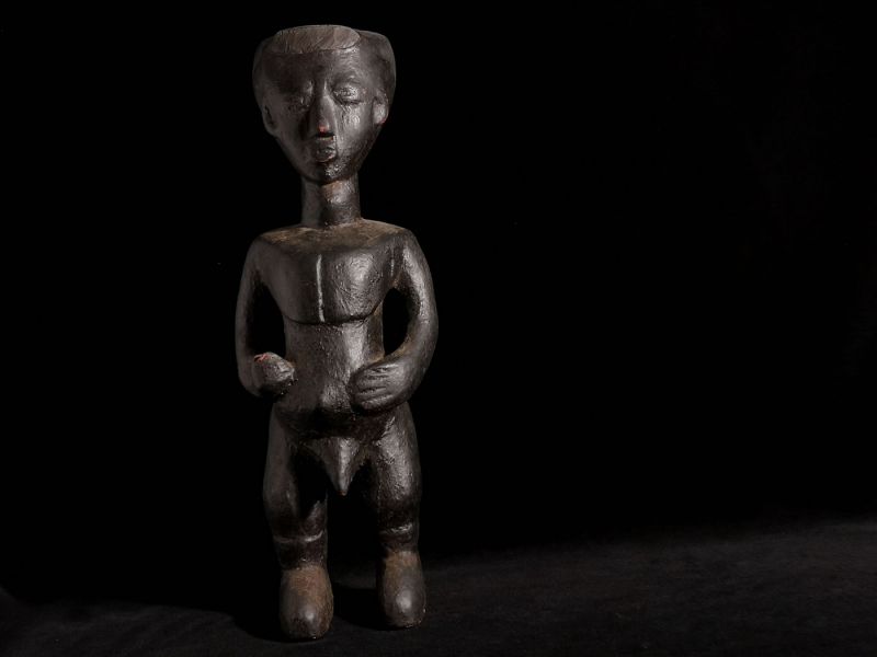 Männliche Standfigur der Lobi (1970 – 1980) aus Westafrika / Elfenbeinküste, handgeschnitzt mit roter Grundierung und schwarz nachpatiniert; interessante Komposition und tolle Proportionen; flacher Kopf und spitzer Penis; vermutlich hatte die Figur früher einmal etwas in der rechten Hand; Trockenrisse; dem Alter entsprechende Gebrauchsspuren; Maße: 40,5 cm; Provenienz: aus dem Nachlass der Sammlung „Jürgen Maurer (1939-2018)“, bekannter Geschäftsmann, Kunstsammler und Chronist aus Heppenheim http://www.kunstsammlungmaurer.de