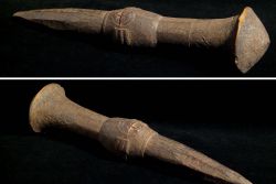 Alter „Nandwa Blawa“ Zeremonialwedel (Fliegenwedel) der Baule; Elfenbeinküste; erste Hälfte 20. Jahrhundert; detaillierter geschnitzter Griff eines zeremoniellen Fliegenwedels für hochrangige Würdenträger eines Herrscher-Clans; diese Objekte wurden bei Feierlichkeiten als Zeichen von Rang und Zugehörigkeit präsentiert; der Griff ist mit feinen geometrischen Rillendekor und drei Ahnengesichtern im typischen Baule-Stil verziert; der Wedel besteht aus hartem, braunem Holz; an der Spitze wurden lange Tierhaare gebunden; hohe Qualität; kleine Schäden an der Kante des oberen 'Pilzes' (siehe Fotos); Gebrauchs-Patina; dem Alter entsprechende Gebrauchsspuren; Maße: 37,5 cm; Provenienz: Nachlass / Sammlung Gundi und Heinz Scharpf (1940-2018). Die berühmten Tierpfleger aus dem zoologisch-botanischen Garten Wilhelma in Stuttgart, hatten die afrikanischen Objekte während ihrer Reisen nach Kamerun und Westafrika in den 1960/70er Jahren erworben;
