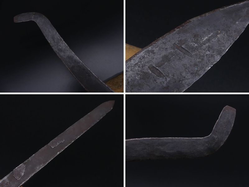 Die Klinge weist eine schöne dunkle Alterspatina sowie dem Alter entsprechende Gebrauchsspuren auf während der Griffbereich originalgetreu ohne Ummantelung belassen wurde. Ursprünglich wurden diese beeindruckenden Waffen oft in Bündeln von drei oder mehr Stück in speziellen Lederköchern getragen und erreichten als präzise Wurfgeschosse eine Reichweite von bis zu 30 Metern. Neben der Verwendung im Krieg und bei der Jagd dienten solche Messer den Völkern in der Grenzregion Tschad und Kamerun auch als wichtiges Statussymbol und kamen bei zeremoniellen Anlässen zum Einsatz. Mit einer beachtlichen Größe von ca. 64 x 14,5 cm ist dieses Stück ein faszinierendes Beispiel für die Verbindung von funktionalem Schneidwerkzeug und kulturellem Prestigeobjekt. Roststellen am Eisen; dem Alter entsprechende Gebrauchsspuren.