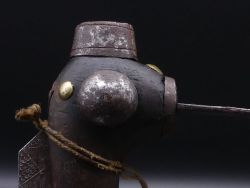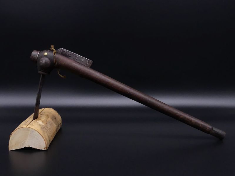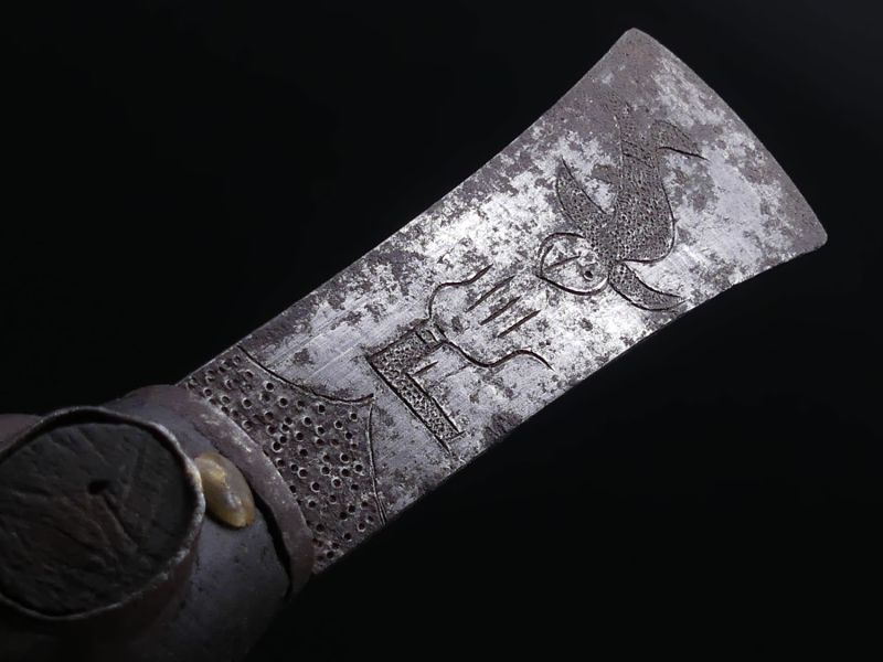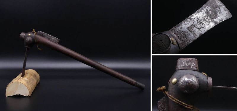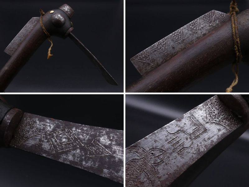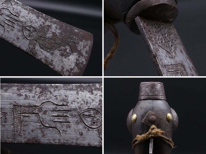 Das Objekt misst ca. 49 x 19 cm und verfügt über eine kurze massiv geschmiedete Eisenklinge die beidseitig mit feinen Gravuren verziert und stabil auf einem dunklen Hartholzschaft montiert ist während die Rückenseite der Klinge einen markanten verzierten Metallkamm im Irokesen Look aufweist der dem Stück eine kriegerische und zugleich würdevolle Ästhetik verleiht. Besonders hervorzuheben ist die aufwendige Montage am Kopfende die durch zwei große eiserne Nieten auf beiden Seiten gesichert wird direkt gefolgt von dekorativen Messingnieten und einem abschließenden Metallband am oberen Ende was im Gesamtbild die Züge einer menschlichen Gestalt formt. Der Hartholzschaft zeigt eine tiefe authentische Patina und trägt am Griff noch eine alte Schnur die als Rest einer ursprünglichen Etikettierung auf eine frühere Dokumentation in einer Sammlung hindeuten könnte. Roststellen am Eisen; dem Alter entsprechende Gebrauchsspuren.