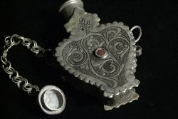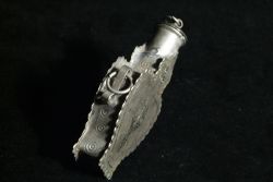 Antike Schnupftabak-Flasche (Snuffbottle) in Form einer Chatelaine; 19. Jahrhundert – Viktorianisch; auf beiden Seiten mit floralen Gravuren; auf der vorderen Seite ist vermutlich eine kleine Koralle eingesetzt; kleiner Deckel welcher mit einer Kette verbunden ist; die Chatelaine ist ein dekorativer Anhänger, mit dessen Hilfe kleine Gegenstände an der Kleidung befestigt waren; unbekanntes Metall (nicht magnetisch), dem Alter entsprechende Gebrauchsspuren; Maße: 5 x 8,5 cm