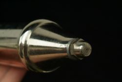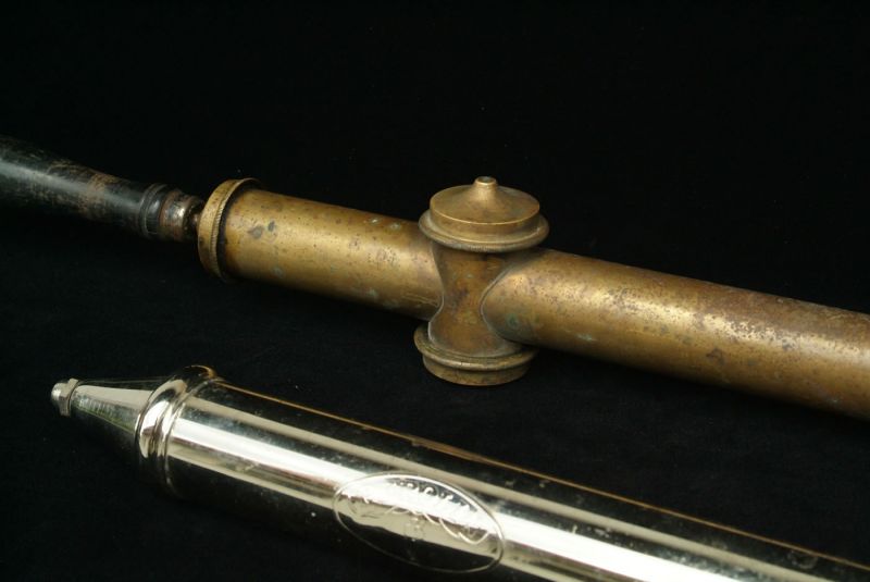 Eine alte Desinfektionsspritze (Luft Desinfektor) von PEROLIN; altes Werkzeug für Kammerjäger zur Schädlingsbekämpfung; um 1900; Chrom: 39 cm und eine antike Blumenspritze aus Messing mit Holzgriff, ebenfalls für den Einsatz zur Schädlingsbekämpfung; Maße Messing: 52 cm