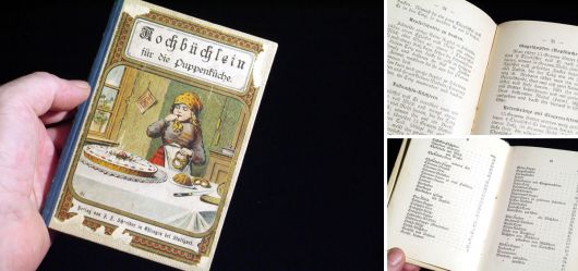 Sehr seltenes „Kochbüchlein für die Puppenküche oder erste Anweisung zum Kochen für Mädchen von 8 - 14 Jahren“; Nach dem Löffler'schen Kochbuch bearbeitet; von Julie Bimbach; 30. Auflage; um 1890; Einband berieben und teilweise beschädigt (siehe Fotos); sonst guter Zustand; viele alte Rezepte wie zb.: Baumwollen Suppe, Warmes Bier, Fastnachts-Küchlein, Hirschhörnlein, Schneeballen, Zoten Klötze, dem Alter entsprechende Gebrauchsspuren