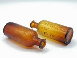 Zwei braune Anilinglasflaschen mit der Aufschrift "Actiengesellschaft für Anilinfabrikation Berlin S.O." (Anilinhersteller, Berlin), erste Hälfte 20. Jahrhundert; eine Flasche mit Jahresangabe “36”; auf der Standfläche geprägte Inhaltsangabe 1/10 L; Anilin ist eine aromatische organische Verbindung mit einer chemischen Formel zum Färben von Textilien; die Gesellschaft für Anilinfabrikation mbH war Partner von BAYER, AGFA und BASF; ein tolles Objekt für Glassammler; dem Alter entsprechende Gebrauchsspuren; Maße: 13 cm