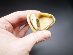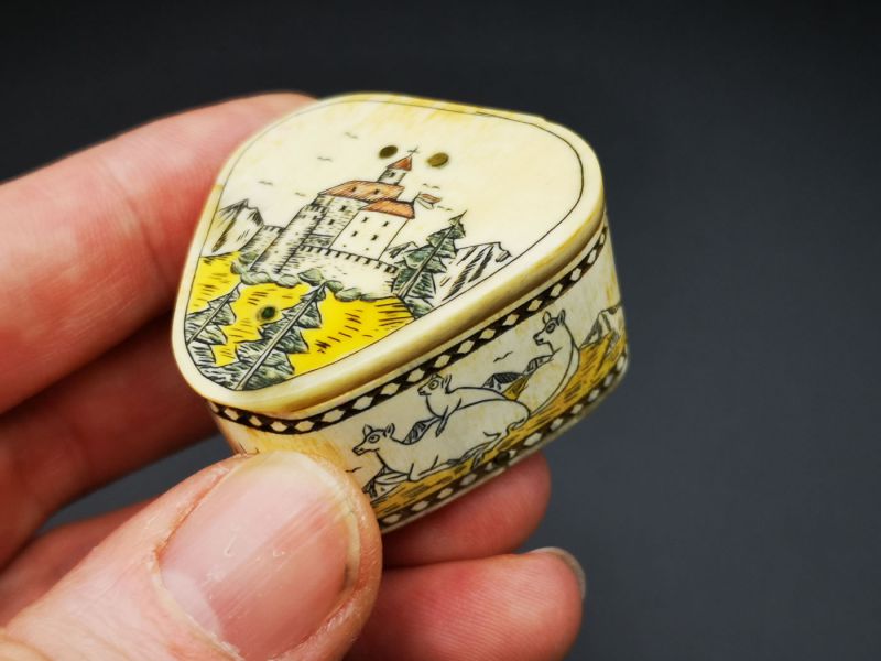 Sehr seltene „Sterzinger Hornarbeit“ / Schnupftabakdose aus Horn, in Museumsqualität; 19. Jahrhundert - Tirol zwischen 1830 und 1880; handbemalt; gravierter Dekor; am Rand drei Tierszenen (Rehe, Steinbock und Gämse im Gebirge bei Sonnenaufgang); am Deckel eine Burg (unbekannt), im Hintergrund ist ein Gebirge abgebildet; am Dosen-Boden eine Wildrose mit Hagebutte und im oberen Eck ein Doppelherz mit durchbohrten Pfeil; Scharnierdeckel; Dicht schließend, sehr gute und wundervolle Erhaltung; dem Alter entsprechende Gebrauchsspuren; Maße: 3,8 x 2,2 cm