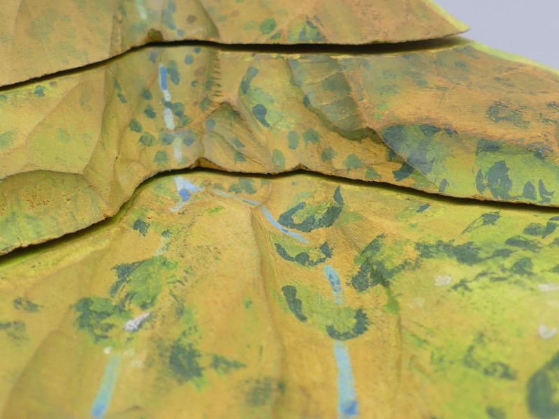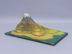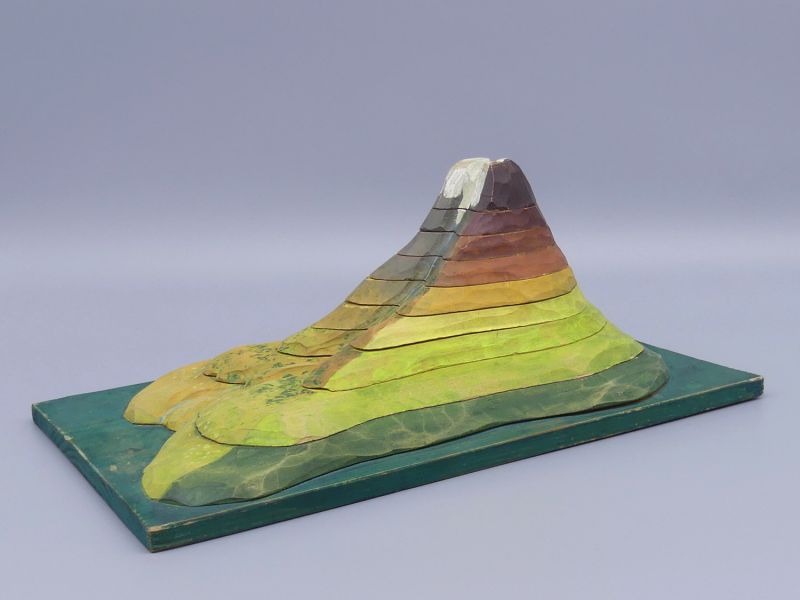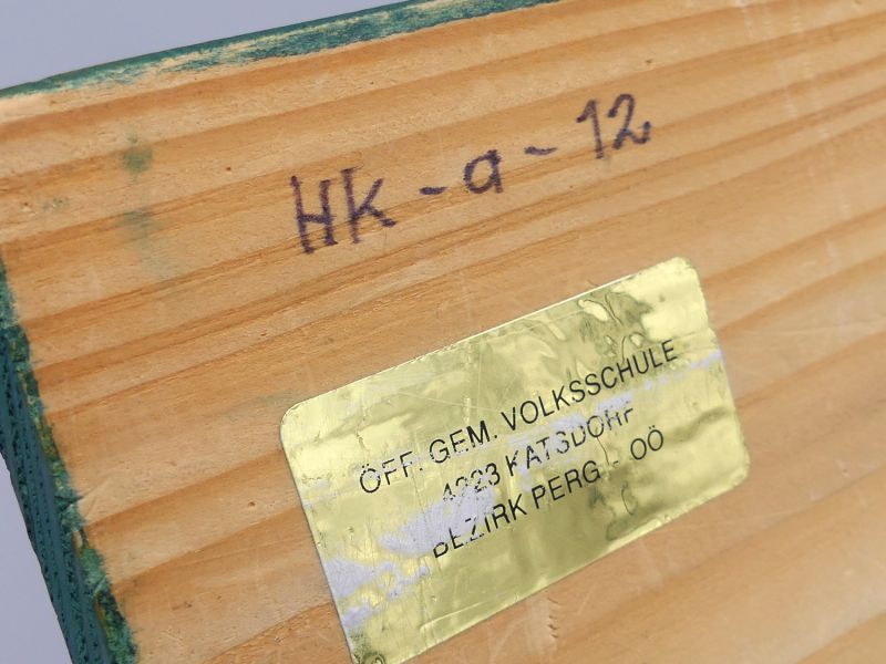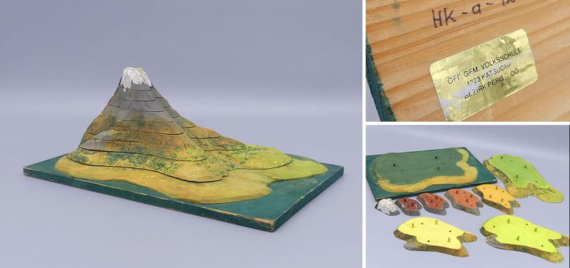 Großartige Handarbeit - Das Modell ist aus Holz gefertigt und liebevoll handbemalt, mit Details wie einer weißen Gipfelkappe und einem Bachlauf. Seine isoliert-kegelförmige Gestalt weckt Assoziationen an berühmte Berge, wie den berühmten Kirkjufell in Island oder an die idealisierte Form majestätischer Stratovulkane Die genaue Identität des abgebildeten Berges bleibt dabei ein neugierig machendes Rätsel. Der Aufkleber auf der Unterseite des Modells identifiziert die Herkunft dieses historischen Lehrmittels präzise und bestätigt seine Verwendung in Österreich: Öff. Gem. Volksschule darunter die Postleitzahl 4223 Katsdorf und die Angabe Bezirk Perg –Oberösterreich. Die oberhalb des Aufklebers in Holz geschriebene Kennzeichnung HK-a-12 ist höchstwahrscheinlich eine interne Inventarnummer der Schule.