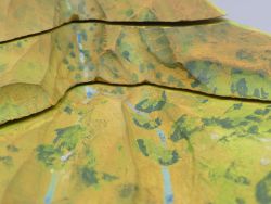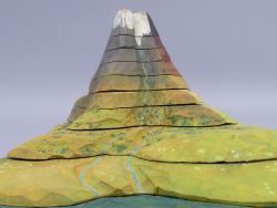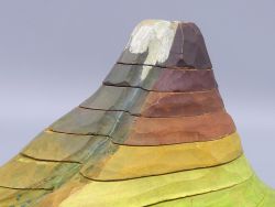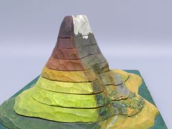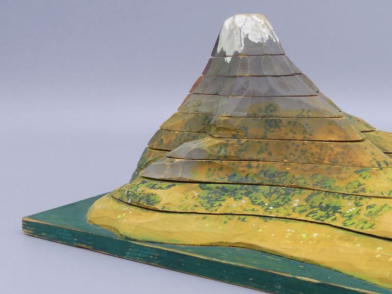 Das Modell besteht aus neun präzise gefertigten Holzsegmenten, die den Berg Schicht für Schicht (topographische Daten) darstellen. Die Besonderheit liegt darin, dass es sich um ein echtes Schnittmodell handelt: Die Segmente lassen sich vollständig auseinandernehmen.