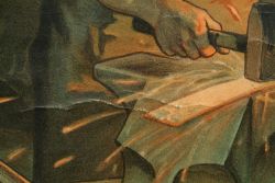 Schulwandbild, Anschauungsunterricht, Lehrtafel aus Karton ca. 1925 "Der Schmied"Hersteller A. Pichler’s Witwe & Sohn, Buchhandlung und Lehrmittelanstalt, Wien & Leipzig; auf der Rückseite ein hangeschriebenes Gedicht zum Schmied; dem Alter entsprechende Gebrauchsspuren; Maße: 90 cm x 67 cm;