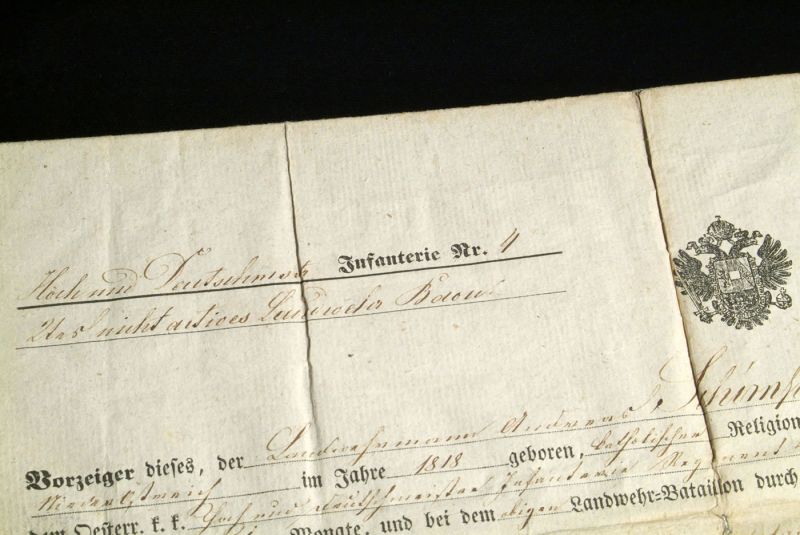 Altes Militär-Dokument; Entlassungsschein eines Soldaten des k.u.k. Infanterieregiments der „Hoch- und Deutschmeister" welches ein Infanterie-Regiment der kaiserlich-habsburgischen und später der k.u.k. Armee war. Der Soldat hat über 10 Jahre beim Landwehr Bataillon gedient. Mehrere Unterschriften und der Vermerk: „Österreichisch-Apostolischen Majestät wirklicher Oberstwachtmeister und des Infanterie Regiments Hoch und Deutschmeister (Commandant)“ mit Bezirkstempel; das Dokument ist gefaltet und lässt sich einmal aufklappen; auf der Rückseite eine Personenbeschreibung des Soldaten. Ausgestellt im Jahr 1852; Kleine Risse an den Rändern, Stockflecken, dem Alter entsprechende Gebrauchsspuren; Maße: 38 x 23,5 cm (1x gefaltet)