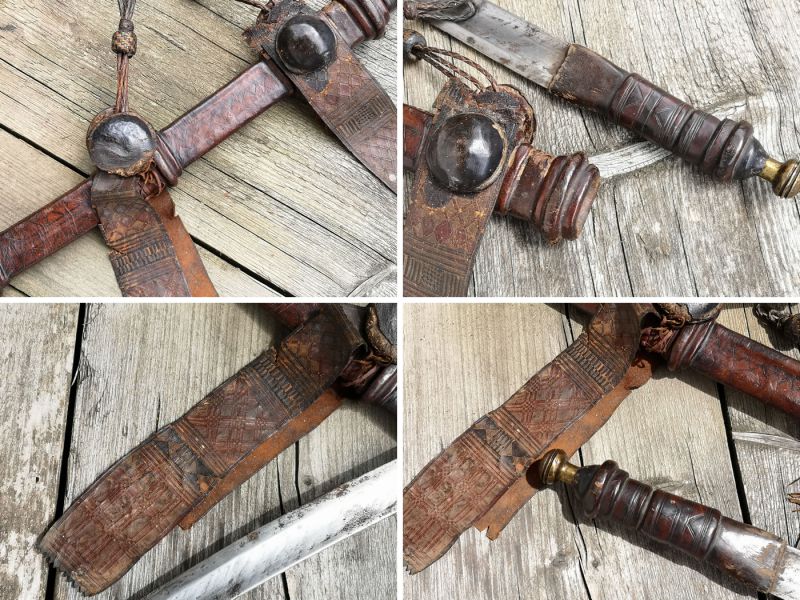 Mandingo Schwert mit leicht gebogener Eisen-Klinge und dekorierter Leder-Scheide; 19. Jahrhundert – (Mandinka, Mandinko, Sose) Senegal, Burkina Faso, Elfenbeinküste; der Griff ist in rot gefärbtem Leder mit geprägtem Linien-Dekor gefasst, der Knauf ist aus gegossenem Messing gefertigt; die Schwert-Scheide besteht aus rot und dunkel gefärbtem Leder mit geprägten, geometrischen Dekor und Flechtwerk aus zweifarbigen Leder-Streifen; diese Schwerter wurden vom Stammesschmied im europäischen Stil des 19. Jahrhunderts hergestellt; der Griff ist fest verankert und hat eine dunkle Patina; Das untere Ende der Leder-Scheide ist mit bemaltem Stammesmuster verziert, das Leder hat Risse, die breiten Lederbänder sind nur teilweise erhalten (siehe Fotos); ein großartiges Ausstellungsstück; dem Alter entsprechende Gebrauchsspuren; Maße Schwert: 71 cm – Maße Scheide: 60 cm