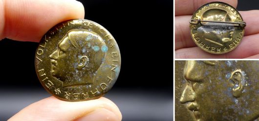 3. Reich Hitler-Abzeichen (Abzeichen, Pin; Brosche) - Ein Volk, ein Reich, ein Führer; guter Zustand, leicht fleckig; dem alter entsprechende Gebrauchsspuren; Maße: ca. 2,2 cm Der Verkauf und die Lieferung von Gegenständen des 3. Reiches unterliegen den gesetzlichen Bestimmungen der §§ 86 Abs. III und 86a StGB. Der Besteller verpflichtet sich mit jeder Bestellung zur Einhaltung der genannten §§. Gerichtsstand und Erfüllungsort ist Wien. Jeder Besteller versichert die Kenntnisnahme der §§ 86/III und 86a. Ferner wird vom Besteller versichert, daß er den Shop und die darin abgebildeten Gegenstände aus der Zeit des 3. Reiches nur zu Zwecken der staatsbürgerlichen Aufklärung, der Abwehr verfassungswidriger Bestrebungen, der Kunst oder der Wissenschaft, der Forschung oder der Lehre, der Berichterstattung über Vorgänge des Zeitgeschehens oder der Geschichte oder ähnlichen Zwecken erwirbt.
