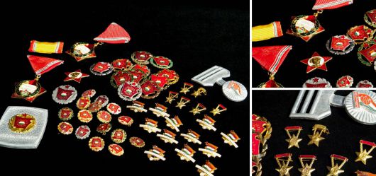 Konvolut (52 Stück) Medaillen der ungarischen Volksrepublik (Sozialismus); Arbeiterabzeichen, Pins und eine Gürtelschnalle; Ende der 1970er - 1980er Jahre; "Szocialista Brigád", „Kiváló Munkaert“, „ifjúság a szocializmusért“, etc.; dem Alter entsprechende Gebrauchsspuren