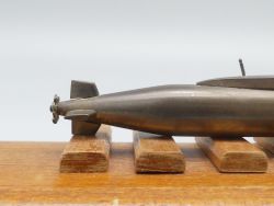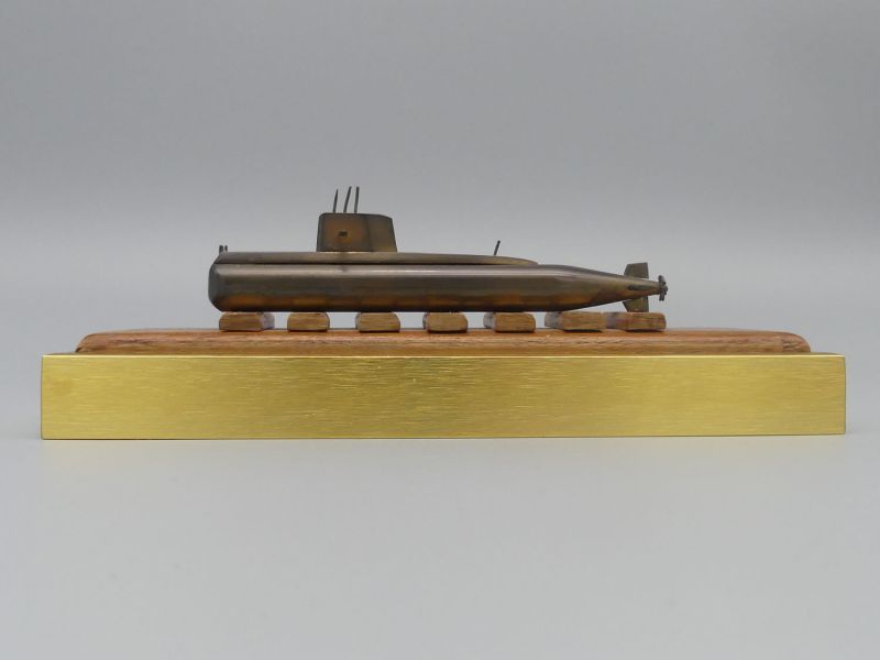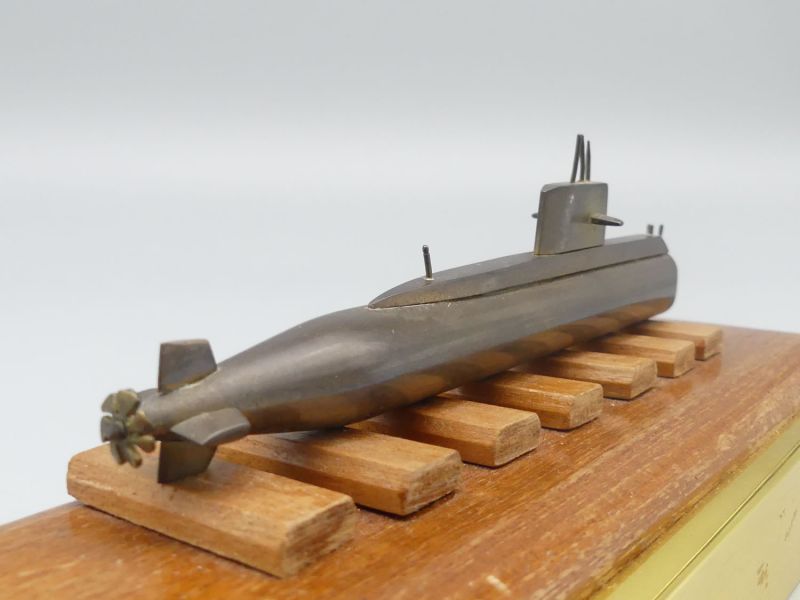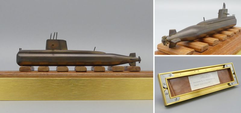 In der Ära des Kalten Krieges galt die TR-1700 als eines der modernsten konventionellen U-Boote weltweit und dieses Modell wurde, vermutlich anlässlich eines feierlichen Aktes in der Werft an hochrangige Persönlichkeiten oder Projektbeteiligte überreicht. Es handelt sich um ein massives und sehr gut erhaltenes Sammlerstück das durch seine präzise Verarbeitung und die authentische Patina sowohl für Maritim-Sammler als auch für Technikbegeisterte von höchstem Interesse ist. Dem Alter entsprechende Gebrauchsspuren; Maße Sockel: 24 x 7,5 x 3 cm; Modell Maße: 15 x 4,2 x 1,5 cm