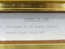 Offizielles Repräsentationsmodell aus Metall der U-Boot Klasse TR-1700; Werft, Astillero M. M. Domecq García, Buenos Aires 27.06.1987. Dieses exzellent verarbeitete Werftmodell aus massivem Metall repräsentiert die TR-1700-Klasse der argentinischen Marine und ist ein bedeutendes Zeugnis deutsch-argentinischer Rüstungshistorie der 1980er Jahre.