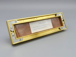 Die detailgetreue Nachbildung des Rumpfes und des Turms dokumentiert den fortschrittlichen Entwurf der Thyssen Nordseewerke, während die Plakette auf der Vorderseite die renommierte Werft Manuel Domecq García in Buenos Aires sowie das spezifische Datum 27.06.1987 ausweist. Das Modell ruht auf einem aufwendig gefertigten Sockel aus poliertem Edelholz der durch schwere Messingstützen und eine gravierte Messingplatte ergänzt wird, was die Wertigkeit dieses offiziellen Präsentes unterstreicht.