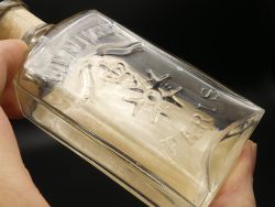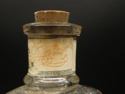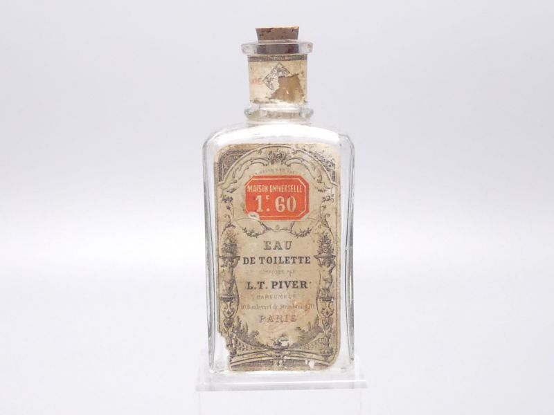 Die vorliegende Flasche stammt aus der Glanzzeit der Marke der sogenannten Belle Époque. Die auf dem Etikett angegebene Adresse 10 Boulevart de Strasbourg 10 Paris grenzt die Herstellung auf die Jahre ca. 1870 bis 1910 ein. Das Alter wird durch den originalen Korkverschluss und die handwerkliche Flaschenbauart eindeutig belegt. Die gravierte Relief-Prägung L.T. PIVER auf der Rückseite über einem Sternenorden mit Krone und dem Schriftzug PARIS bezeugt die einstigen königlichen Auszeichnungen und den Status der Marke. Das schwarz-weiße Etikett ist ein Kunstwerk für sich. Es zeigt seitlich zwei detaillierte Putten Engelchen die Blumenvasen halten ein Motiv das auf das ursprüngliche Emblem des Hauses Piver von 1774 zurückgeht. Ein faszinierendes Detail ist das rote Rechteck-Etikett MAISON UNIVERSELLE 1F.60 das den damaligen Verkaufspreis 1 Franc 60 Centimes und den Händler Maison Universelle festhält. Es verdeckt das zentrale Markenemblem das ursprünglich eine allegorische Darstellung der Königin der Blumen zeigte.