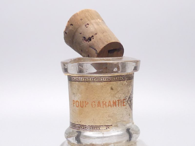 Die Flasche ist leer und misst 12 cm in der Höhe 5,3 cm in der Breite und 3 cm in der Tiefe. Sie befindet sich in einem beeindruckenden altersgemäßen Zustand. Das Etikett am Flaschenhals Pour Garantie ist teils berieben aber lesbar. Das Hauptetikett weist leichten Abrieb und eine kleine Fehlstelle in der linken unteren Ecke auf die Grafiken und Texte sind jedoch erhalten. Dieses Objekt ist ein Must-have für Sammlungen die sich auf französische Vintage-Parfümerie oder Objekte der Belle Époque spezialisieren.