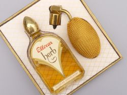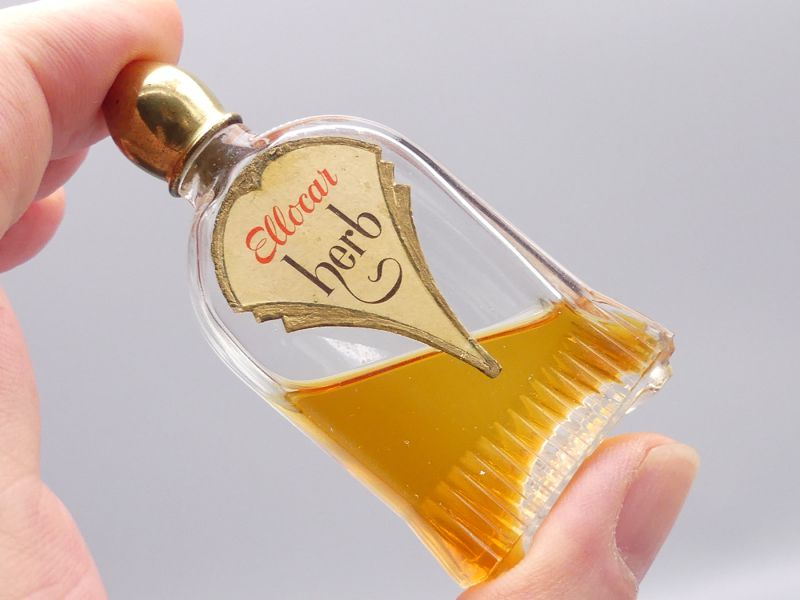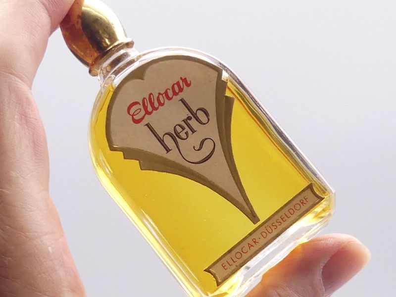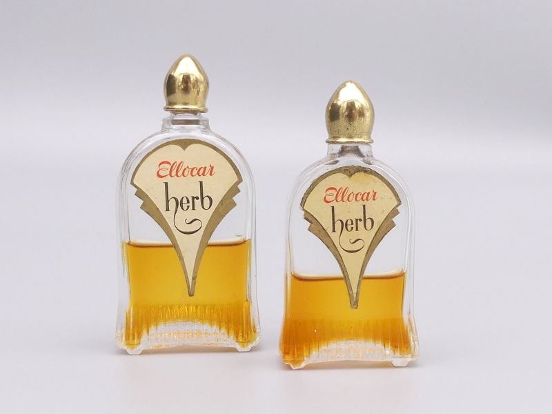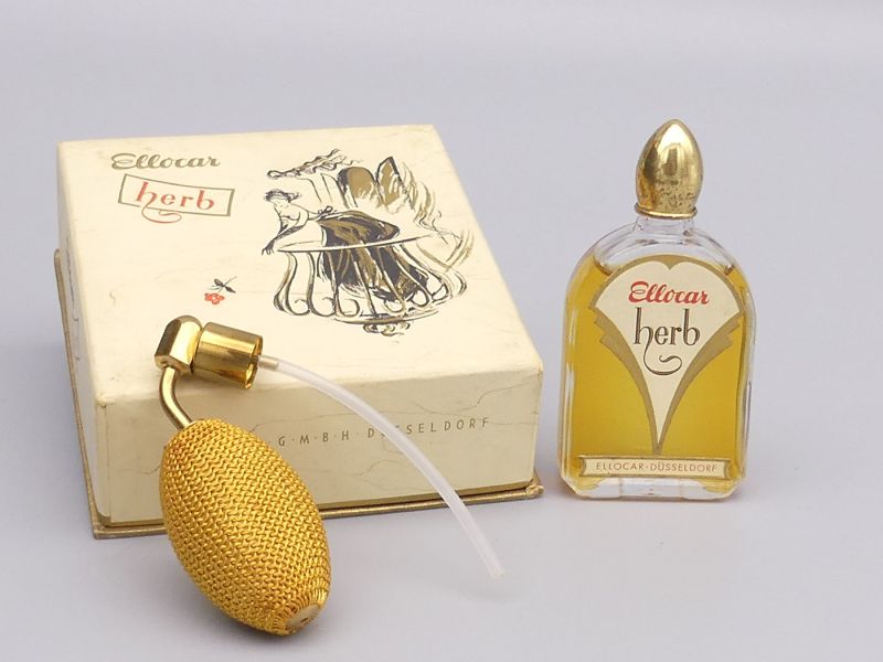 Enthalten sind drei Flakons des Herrendufts Ellocar Herb (1953) in den Größen 10 ml, 16 ml und ca. 25 ml. Die große Flasche ist noch versiegelt, voll, mit Originalkarton und einem Messingverschluss inklusive abgeflachtem Zerstäuberball, der heute ausgehärtet ist. Die beiden kleineren Fläschchen sind etwa halbvoll, was ihre Authentizität und den gebrauchten Charme betont. Der Herb-Duft war einst als würzig-pudrige Komposition beliebt und gilt heute als Repräsentant seiner Zeit.