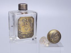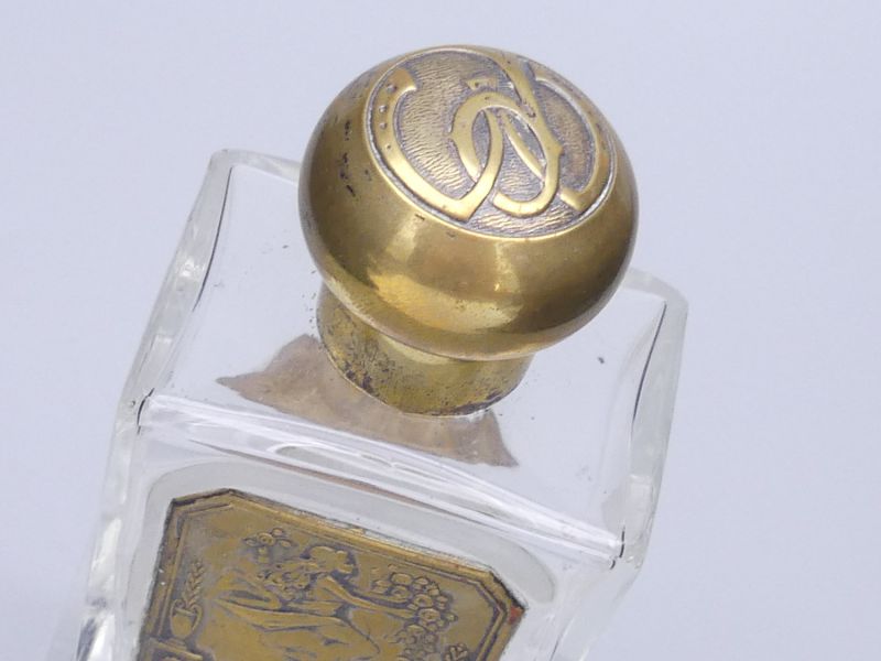Der Flakon besitzt einen massiven, runden Schraubverschluss aus Messing, der einen ansprechenden Kontrast zum klaren Glas und dem dunkler patinierten Relief bildet. Unter dem Messingverschluss befindet sich der originale innere Glasstopper, der noch sehr gut erhalten ist. Auf der Rückseite ist ein kleines, rechteckiges Papieretikett angebracht, das als Firmen-Siegel der Parfumerie Moderne Paris diente. Dies ist ein Must-Have für jeden ernsthaften Sammler von Vintage-Parfümflakons oder Liebhaber französischer Art Déco-Kunst! Dem Alter entsprechende Gebrauchsspuren. Die Parfümflasche wird ohne Display angeboten.