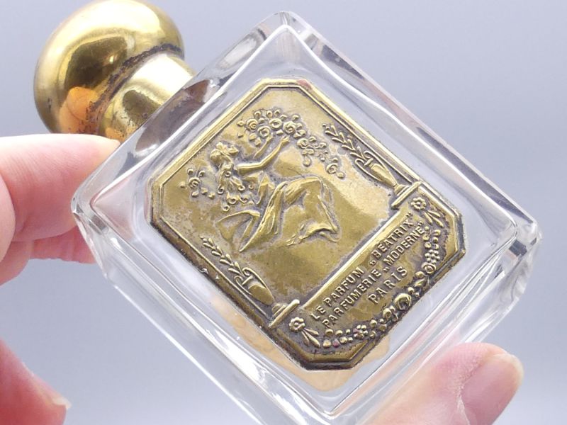Wir präsentieren ein herausragendes Stück Parfümgeschichte, den historischen Parfümflakon "Le Parfum Beatrix" der renommierten Parfumerie Moderne aus Paris, Frankreich. Dieses seltene Sammlerstück, mit den Maßen von ca. 5,5 x 4 x 9,5 cm, wird auf die Ära zwischen den 1910er und 1930er Jahren geschätzt und repräsentiert stilistisch den Übergang vom späten Jugendstil zum eleganten Art Déco. Die Parfumerie Moderne war ein historisches französisches Parfümhaus, das im frühen 20. Jahrhundert in der französischen Hauptstadt ansässig war und dessen Produkte heute als gesuchte Raritäten gelten.