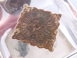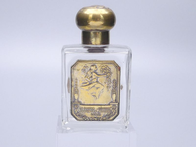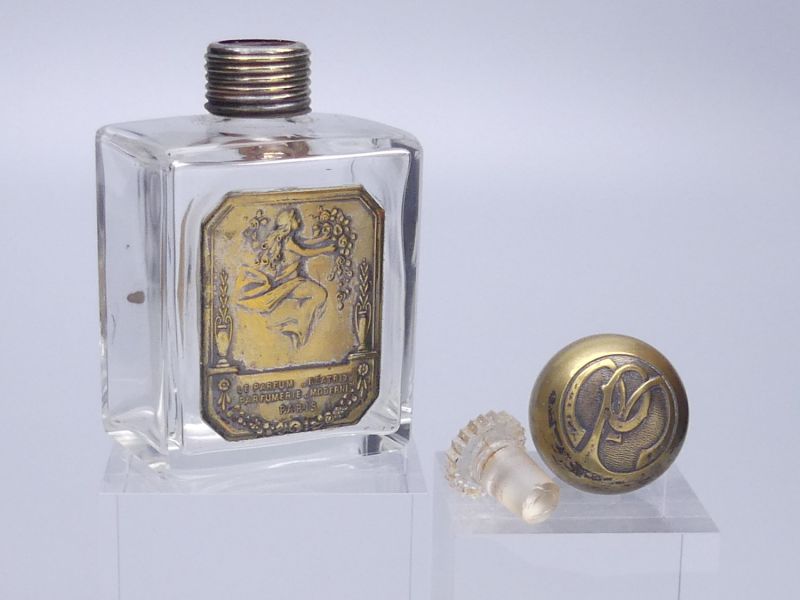 Der rechteckige Flakon aus klarem Glas besticht durch eine schlichte, zeitlose Eleganz, die für die hochwertigen Parfümpräsentationen dieser Epoche typisch war. Sein imposantestes Merkmal ist das große, reliefierte Etikett aus Messing auf der Vorderseite, das eine schwebende Frau mit Blumen in der Hand zeigt. Solch detailreiche Metallplaketten waren ein Kennzeichen für besonders luxuriöse Parfümkreationen!