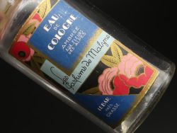 Extrem seltener und historischer Parfümflakon des wenig dokumentierten Hauses Les Parfums de Malyne - Eau de Cologne Ambrée Aux fleurs des Alpes. Dieses Unternehmen wurde durch die Société RODIER in Paris registriert und spezialisierte sich auf hygienische Parfüms und ähnliche Produkte. Am Etikett die Herstellungsorte Le Bar (wahrscheinlich Le Bar-sur-Loup bei Grasse) Paris und Grasse.