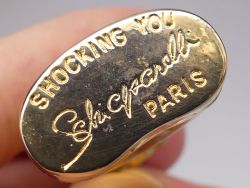 Ergänzt wird das Juwel durch einen großen, fast vollen 100 ml Zerstäuber des ikonischen Duftes Shocking. Dieser Flakon repräsentiert die ursprüngliche Vision von Schiaparelli. Sein legendäres Design, das die Körperform von Mae West und die Schneiderpuppe von Schiaparelli zitiert, stammt von der Künstlerin Léonor Fini. Diese Zerstäuber-Ausführung, die mit Sprayfunktion und einem zusätzlichen Kugelverschluss aus Kunststoff ausgestattet ist, stammt vermutlich aus den 1980er Jahren.