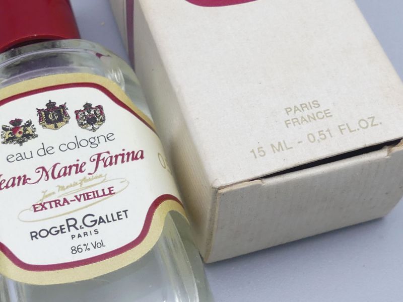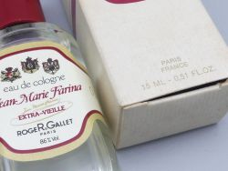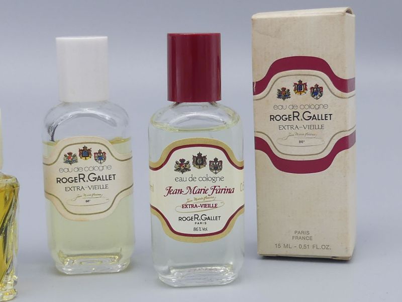 Die beiden 15ml Flaschen Jean Marie Farina Extra Vieille repräsentieren den zeitlosen Klassiker der Marke dessen Rezeptur auf das ursprüngliche Eau de Cologne von 1806 zurückgeht. Die Flasche mit dem roten Verschluss sowie das Exemplar mit dem weißen Verschluss und der dazugehörigen Originalverpackung stammen aus der Zeit um 1960. In dieser Ära waren diese schlichten Glasflakons mit den prachtvollen Wappen Etiketten charakteristisch für das Pariser Haus.