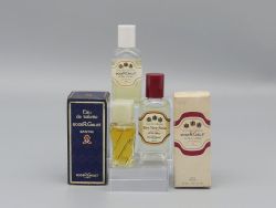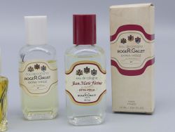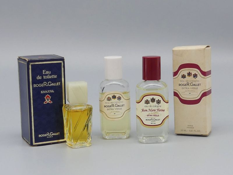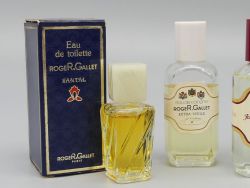 Ergänzt wird dieses Duo durch eine seltene 5ml Miniatur des Duftes Santal inklusive Originalverpackung aus dem Jahr 1978. Dieser Flakon besticht durch seine markante gedrehte Glasstruktur und den quadratischen Verschluss was den stilistischen Übergang in die späten 1970er Jahre markiert. Eine großartige Ergänzung für Ihr Badezimmer stellt dieses dreiteilige Set dar das die handwerkliche Qualität und den ästhetischen Wandel von Roger & Gallet über zwei Jahrzehnte hinweg dokumentiert. Dem Alter entsprechende Gebrauchsspuren; eine Garantie auf die Duftqualität kann aufgrund des Alters nicht übernommen werden. Die Parfüms werden ohne Display angeboten. Maße Flaschenhöhe: 5,5 bis 7,5 cm