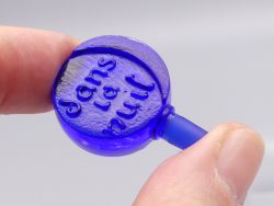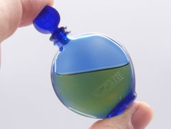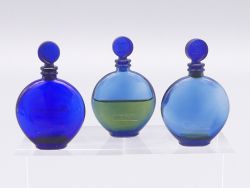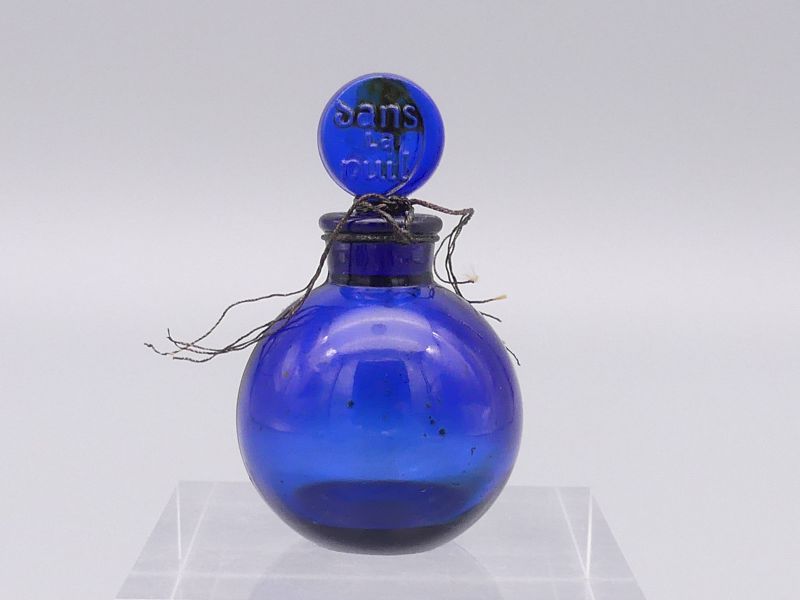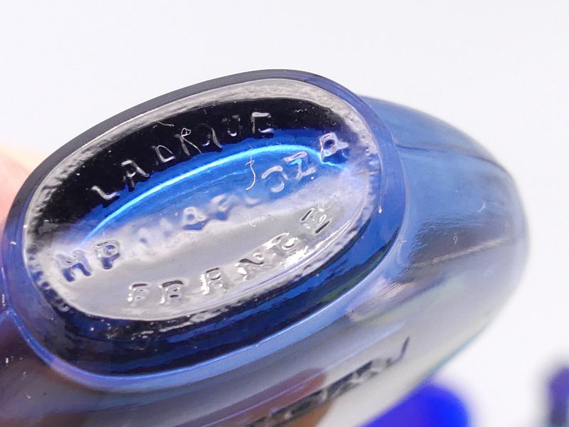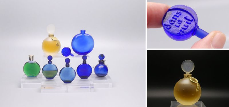 Hinzu kommen fünf Flaschen Dans La Nuit, allesamt im ikonischen tiefblauen Glas. Darunter eine 30ml Flasche mit dem Relief „Worth“ am Bauch und der Bodenprägung „RLALIQUE Creation – French Bottle“, leer und ohne Stopper, jedoch liegt ein weiterer Glasstopper bei, der vermutlich für eine kleinere Variante gedacht ist. Die Miniaturen umfassen drei flache Fläschchen mit je etwa 7ml, Bodenprägung Lalique, eines leer, eines mit Resten, eines mehr als halbvoll. Besonders reizvoll ist die bauchige Dans La Nuit Miniatur mit Glasstopper, am Boden geprägt „Bottle 1/2 Floz, Made in France“, der Flakon trägt wie alle anderen den charakteristischen „Dans la Nuit“-Schriftzug auf dem Verschluss.