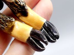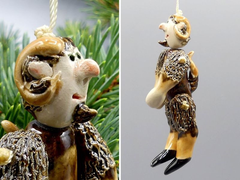 Eine Keramikfigur (Chimäre) vom Künstler Reinhard Mühleder, Ende des 20. Jahrhunderts. Die Figur ist nicht signiert und besteht aus sechs Einzelteilen, die erst nach dem Glasurbrand endgültig zusammengesetzt und wie eine Marionette verbunden werden. Jedes Teil wird von Hand modelliert, glasiert und bemalt. Diese Chimäre stellt eine Mischung aus Widder und Mensch dar. Die Figuren, die als verschiedene Persönlichkeiten gestaltet sind, können sitzen, hängen und auch als Schmuck-Accessoire verwendet werden. Bekannt wurden die Keramikfiguren als Christbaumschmuck und erlangten Kultstatus bei der „Art Advent“, die regelmäßig von „divina art“ veranstaltet wurde.; dem Alter entsprechende Gebrauchsspuren; Maße: ca. 12 cm