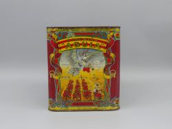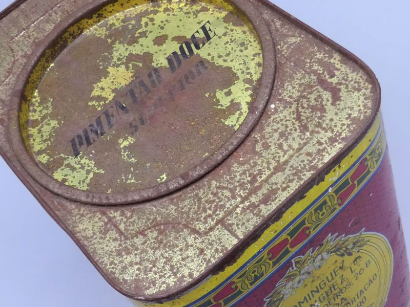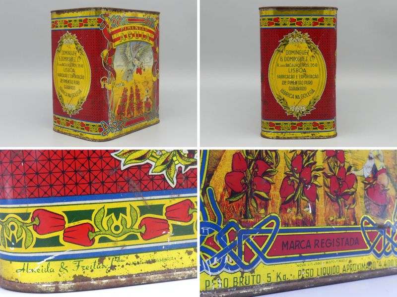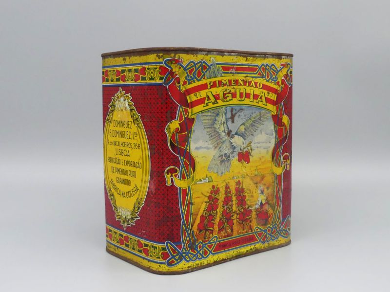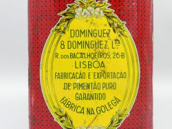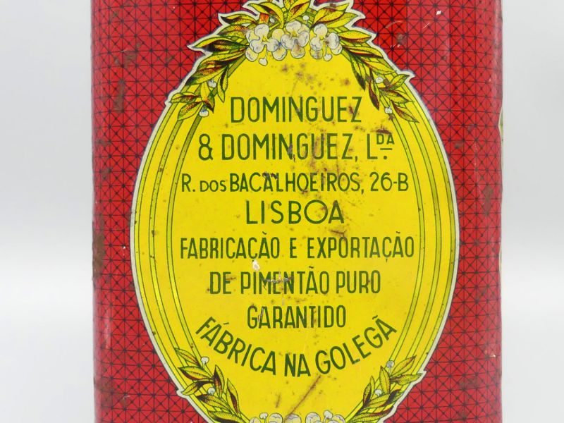 Diese beeindruckende und großformatige Blechdose ist ein herausragendes Dokument der portugiesischen Handelsgeschichte und stammt von der Firma Dominguez & Dominguez Lda die ihren Sitz in der geschichtsträchtigen Rua dos Bacalhoeiros in Lissabon hatte. Die Dose diente zur Lagerung von garantiert reinem Paprikapulver (Pimentão puro garantido) das in der für ihre Landwirtschaft berühmten Region Golegã hergestellt wurde und für den Export sowie den heimischen Markt bestimmt war.